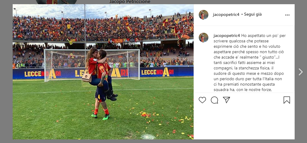 “Ho aspettato un po’ per scrivere qualcosa che potesse esprimere ciò che sento e ho voluto aspettare perché spesso non tutto ciò che accade è realmente “ giusto”. I tanti sacrifici fatti assieme ai miei compagni, la stanchezza fisica, il sudore di questo mese e mezzo dopo un periodo duro per tutta l’Italia non ci ha premiati nonostante questa squadra ha, con le nostre forze, cercato in tutte le maniere possibili di premiare una città a cui, purtroppo, è stata negato anche di entrare in casa propria per sostenerci… Non è una giustificazione, certo, ma ho sempre creduto che l’energia dei nostri tifosi sarebbe stata per noi qualcosa di speciale e importante… Ora, a distanza di giorni, credo che sia giusto vivere questo presente rialzandoci tutti assieme a testa alta non facendo mancare mai impegno e amore per una città che mi ha regalato tanto sia calcisticamente che nella vita di tutti i giorni… Non siamo usciti di scena , siamo solo pronti di nuovo a rinascere ancora più forti… – Poi conclude così – Intanto grazie a tutti voi e chiudo questo post con una frase che amo ‘ non c’è sconfitta nel cuore di chi lotta ’… A presto in giro per le vie di Lecce 🟡🔴💪❤️”