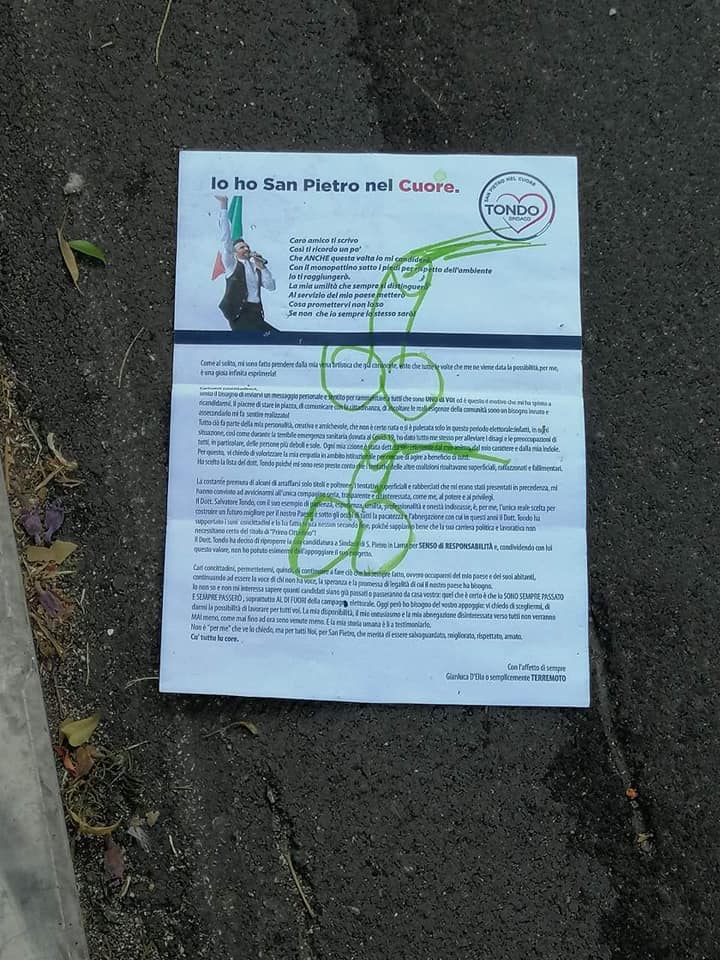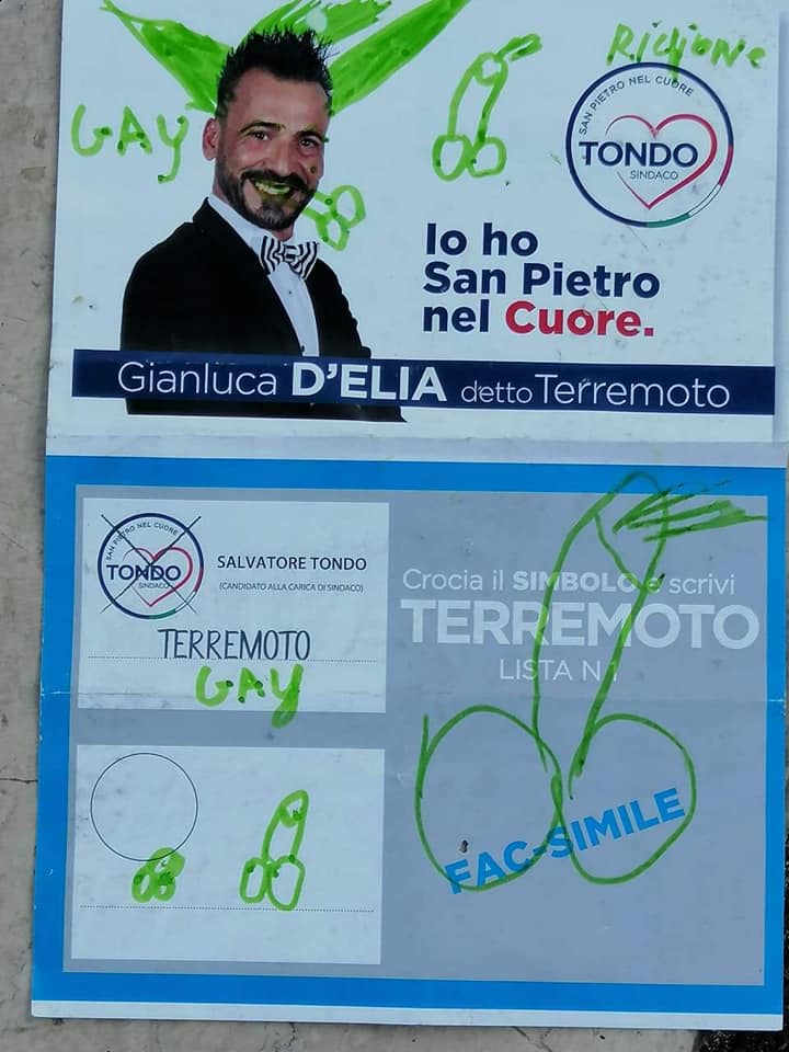 SAN PIETRO IN LAMA – Insulti omofobi e disegni volgari sui volantini del candidato consigliere comunale alle prossime amministrative di San Pietro in Lama, Gianluca D’Elia. È lui stesso a pubblicare le foto dei volantini imbrattati, e non è la prima volta che gli accade di essere attaccato con gli stessi epiteti.