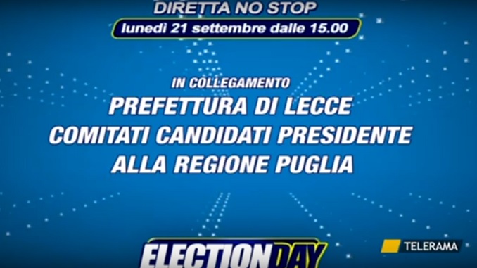 LECCE – Appena i seggi saranno chiusi, alle 15,00 di lunedì 21 settembre, partirà Election Day, la lunga maratona elettorale in diretta no stop su TeleRama, TeleSalento e sui canali social della tv.