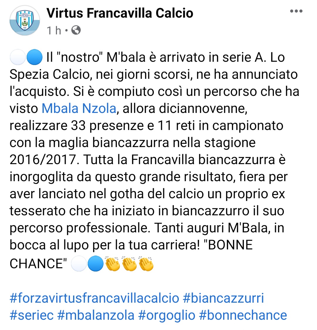 “Il “nostro” M’bala è arrivato in serie A. L’o Spezia nei giorni scorsi, ne ha annunciato l’acquisto. Si è compiuto così un percorso che ha visto Nzola, allora diciannovenne, realizzare 33 presenze e 11 reti in campionato con la maglia biancazzurra nella stagione 2016/2017. Tutta la Francavilla biancazzurra è inorgoglita da questo grande risultato, fiera per aver lanciato nel gotha del calcio un proprio ex tesserato che ha iniziato in biancazzurro il suo percorso professionale. Tanti auguri M’Bala, in bocca al lupo per la tua carriera! “BONNE CHANCE” .