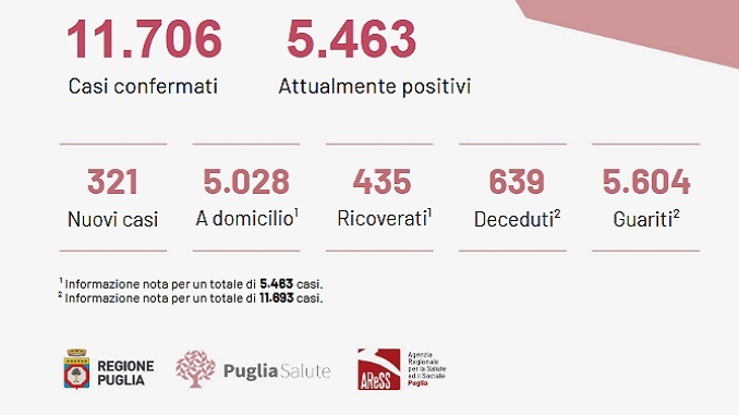 PUGLIA – Covid: nelle ultime 24, in Puglia sono stati registrati 321 nuovi casi positivi, 2446 test effettuati. Lo dice il bollettino regionale odierno.