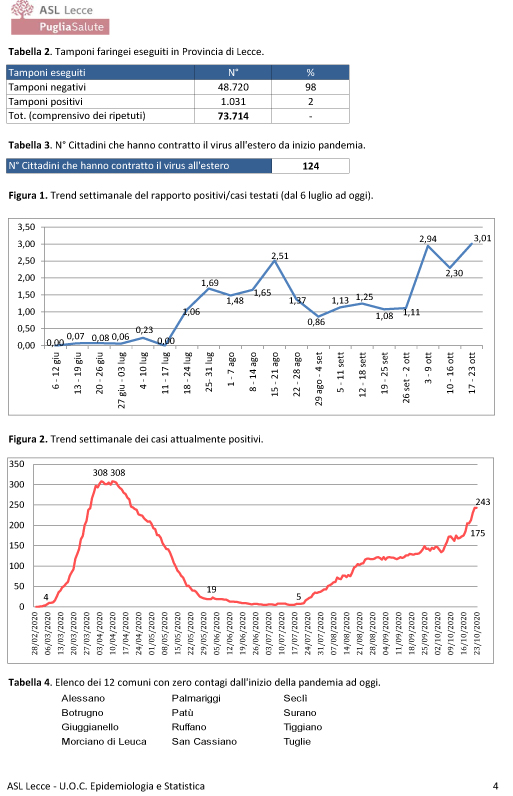LECCE- Attualmente in tutta la provincia di Lecce sono 243 i casi positivi al Covid- 19. Venerdì scorso 16 ottobre erano 175. Un aumento, quindi, in sette giorni, di 68 casi. Ci sono 23 persone ricoverate e sono tutti nell’ospedale di Lecce.