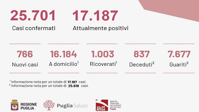 Sono stati registrati 21 decessi: 4 in provincia di Bari, 9 in provincia BAT, 2 in provincia di Brindisi, 3 in provincia di Foggia, 1 in provincia di Lecce, 2 in provincia di Taranto.