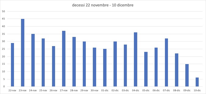 L’assessore alle Politiche della Salute, prof. Pier Luigi Lopalco, spiega: “I decessi riportati nel bollettino odierno non rispecchiano l’andamento giornaliero che vede un picco settimanale di 36 decessi (vedi grafico) lo scorso 4 dicembre. Si ricorda infatti che il bollettino quotidiano riporta solo quanto immesso nel sistema quel giorno e non la data dell’evento”.
