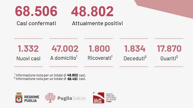 PUGLIA – Covid: oggi, giovedì 10 dicembre 2020, in Puglia sono stati registrati 11.168 test e 1.332 casi positivi.