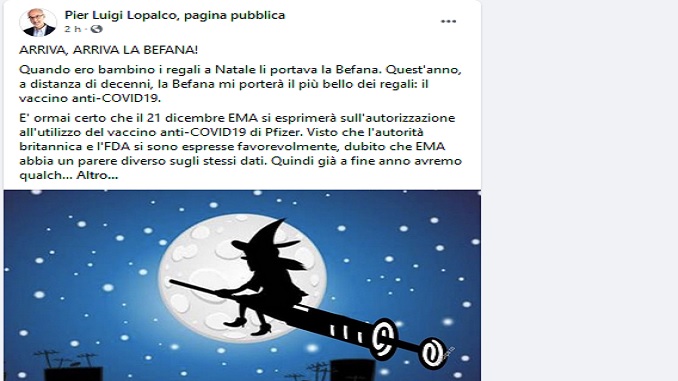 BARI – “Quest’anno la Befana mi porterà il più bello dei regali: il vaccino anti-Covid-19”. Inizia così un post dell’assessore alla Sanità della Regione Puglia, l’epidemiologo Pierluigi Lopalco, sull’arrivo del vaccino anche in Italia.