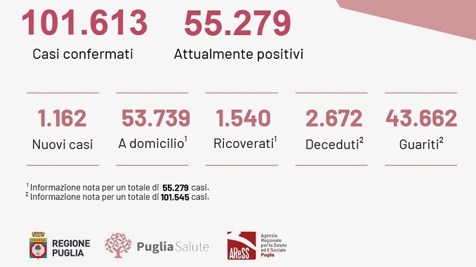Bollettino odierno covid: in Puglia 24 decessi e 1.162 nuovi casi (su 8.510 test)