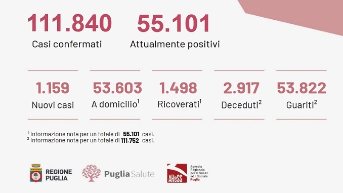 PUGLIA – Il bollettino quotidiano covid: in Puglia, 11.485 test, sono stati registrati 1.159 nuovi casi positivi. 470 in provincia di Bari, 72 in provincia di Brindisi, 108 nella provincia BAT, 119 in provincia di Foggia, 104 in provincia di Lecce, 286 in provincia di Taranto, 1 residente fuori regione. 1 caso di provincia di residenza non nota è stato riclassificato e attribuito.