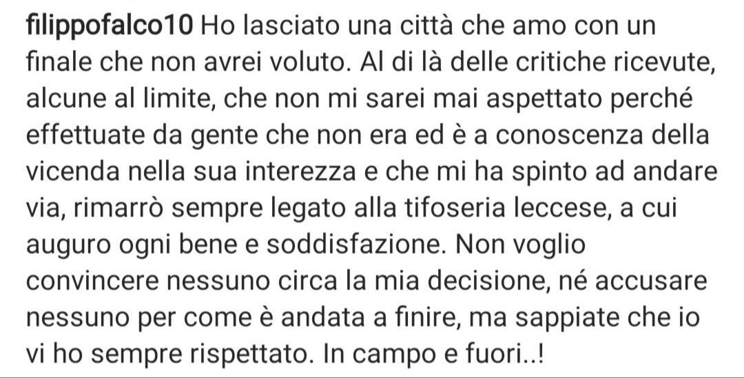Queste le parole del fantasista di Pulsano sul suo profilo personale di instagram. Ai tifosi dice: “Vi ho sempre rispettato. In campo e fuori…“.