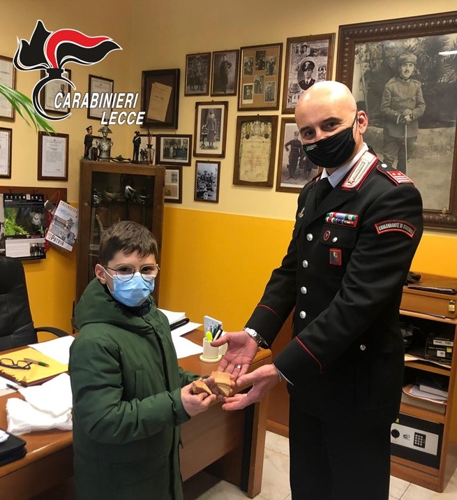 Il comandante della stazione di Nardò Vito De Giorgi, apprezzando l’alto senso civico del bambino, ha voluto premiarlo regalandogli un calendario dei carabinieri.