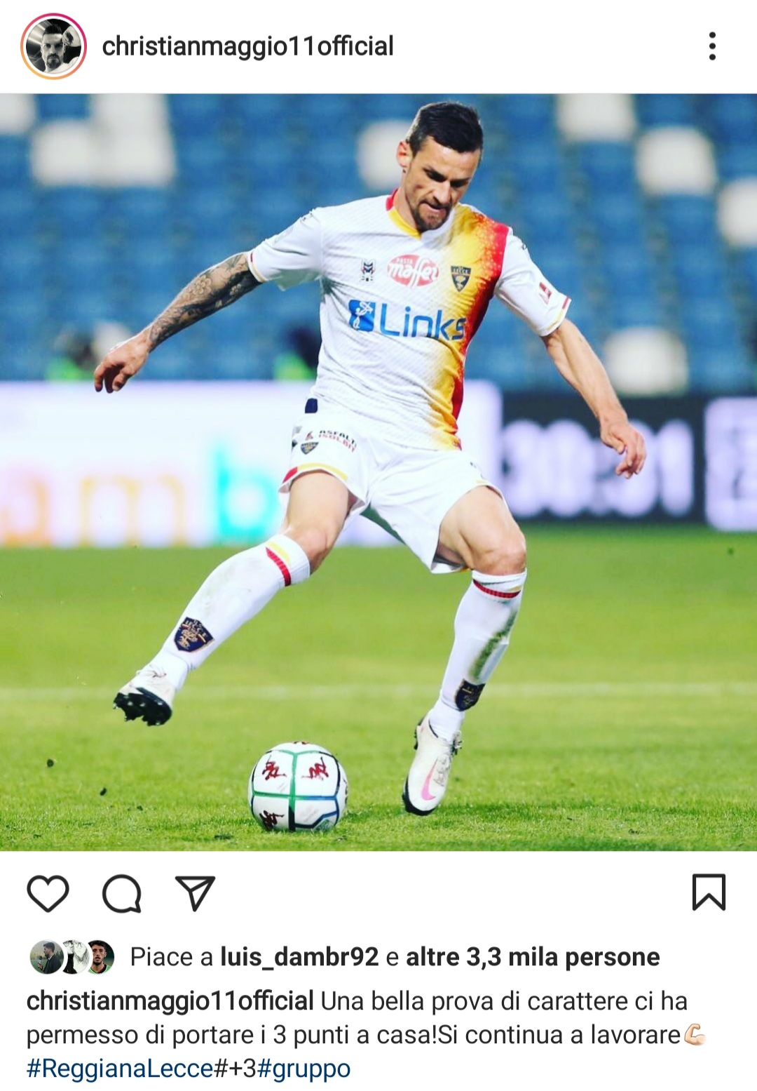 LECCE – “Una bella prova di carattere ci ha permesso di portare i 3 punti a casa! Si continua a lavorare💪🏻”: così Christian Maggio sul suo profilo instagram nell’analizzare la bella e larga vittoria del suo Lecce sulla Reggiana: 0-4 e tutti a casa. Tre punti importantissimi per la classifica, ma anche per il morale e questo il terzino destro giallorosso, 39 anni suonati, lo sa bene. Dall’alto della sua esperienza, Maggio carica i suoi compagni e sogna la massima serie con la maglia dei salentini. Con la voglia di segnare altri gol importanti come quello con il Pescara.
