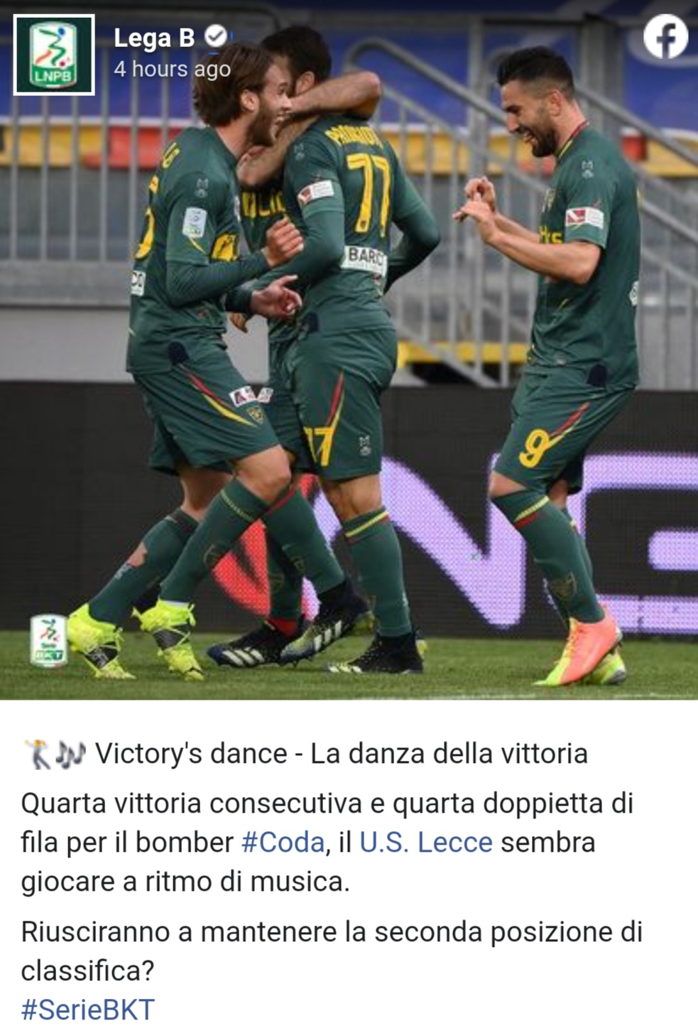 “LA DANZA” – Anche sulla pagina facebook della Lega B, si parla con entusiasmo della quarta vittoria di fila dei giallorossi, trascinati dalla quarta doppietta consecutiva, 20esimo gol stagionale, di Massimo Coda. “La danza della vittoria -si legge nel post- Riusciranno a mantenere la seconda posizione di classifica?”.