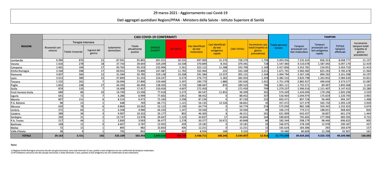 PUGLIA- Sono 33 i decessi registrati in Puglia dall’ultimo bollettino regionale: 18 in provincia di Bari, 2 in provincia di Brindisi, 2 in provincia BAT, 7 in provincia di Foggia, 2 in provincia di Lecce, 2 in provincia di Taranto. Su 5.142 test effettuati, sono stati registrati 786 casi positivi: 350 in provincia di Bari, 90 in provincia di Brindisi, 28 nella provincia BAT, 176 in provincia di Foggia, 99 in provincia di Lecce, 43 in provincia di Taranto. 46.494 sono i casi attualmente positivi. Ed è della Puglia il primato giornaliero d’Italia di accessi nei reparti di Terapia intensiva, con 27 persone ricoverate.