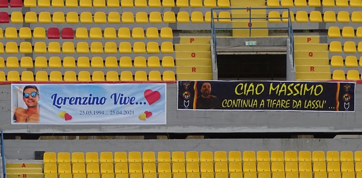 Poi prima del fischio d’inizio c’è stato il ricordo in memoria di Massimo Greco scomparso due settimane fa, dopo aver lottato contro un male incurabile, e di Lorenzo Peluso partito per il suo ultimo viaggio il 25 aprile, a causa di un danno neurologico irreversibile. La sua storia ha commesso il Salento, i suoi genitori nonostante il dolore, con coraggio e generosità e una immensa umanità hanno donato i suoi organi, cuore e fegato, salvando due vite. Toccante il messaggio del club giallorosso: “ Il vostro coraggio e il vostro amore per la maglia giallorossa sono motivo di orgoglio! Sarete per sempre con noi e dal cielo siamo sicuri continuerete a sostenere i nostri colori! Non vi dimenticheremo mai!”. Due striscioni con la loro foto sono stati esposti in tribuna est e nell’assordante silenzio di uno stadio vuoto dove a gridare per qualche minuto è stato il dolce e malinconico ricordo dei due sfortunati tifosi.