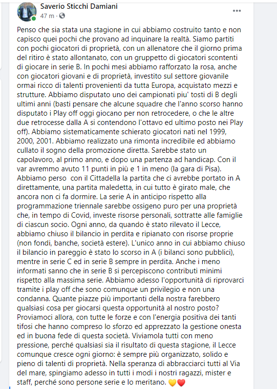 Penso che sia stata una stagione in cui abbiamo costruito tanto e non capisco quei pochi che provano ad inquinare la realtà. Siamo partiti con pochi giocatori di proprietà, con un allenatore che il giorno prima del ritiro è stato allontanato, con un gruppetto di giocatori scontenti di giocare in serie B. In pochi mesi abbiamo rafforzato la rosa, anche con giocatori giovani e di proprietà, investito sul settore giovanile ormai ricco di talenti provenienti da tutta Europa, acquistato mezzi e strutture. Abbiamo disputato uno dei campionati più tosti di B degli ultimi anni (basti pensare che alcune squadre che l’anno scorso hanno disputato i Play off oggi giocano per non retrocedere, o che le altre due retrocesse dalla A si contendono l’ottavo ed ultimo posto nei Play off). Abbiamo sistematicamente schierato giocatori nati nel 1999, 2000, 2001. Abbiamo realizzato una rimonta incredibile ed abbiamo cullato il sogno della promozione diretta. Sarebbe stato un capolavoro, al primo anno, e dopo una partenza ad handicap. Con il var avremmo avuto 11 punti in più e 1 in meno (la gara di Pisa). Abbiamo perso con il Cittadella la partita che ci avrebbe portato in A direttamente, una partita maledetta, in cui tutto è girato male, che ancora non ci fa dormire. La serie A in anticipo rispetto alla programmazione triennale sarebbe ossigeno puro per una proprietà che, in tempo di Covid, investe risorse personali, sottratte alle famiglie di ciascun socio. Ogni anno, da quando è stato rilevato il Lecce, abbiamo chiuso il bilancio in perdita e ripianato con risorse proprie (non fondi, banche, società estere). L’unico anno in cui abbiamo chiuso il bilancio in pareggio è stato lo scorso in A (i bilanci sono pubblici), mentre in serie C ed in serie B sempre in perdita. Anche i meno informati sanno che in serie B si percepiscono contributi minimi rispetto alla massima serie. Abbiamo adesso l’opportunità di riprovarci tramite i play off che sono comunque un privilegio e non una condanna. Quante piazze più importanti della nostra farebbero qualsiasi cosa per giocarsi questa opportunità al nostro posto? Proviamoci allora, con tutte le forze e con l’energia positiva dei tanti tifosi che hanno compreso lo sforzo ed apprezzato la gestione onesta ed in buona fede di questa società. Viviamola tutti con meno pressione, perché qualsiasi sia il risultato di questa stagione, il Lecce comunque cresce ogni giorno: è sempre più organizzato, solido e pieno di talenti di proprietà. Nella speranza di abbracciarci tutti al Via del mare, spingiamo adesso in tutti i modi i nostri ragazzi, mister e staff, perché sono persone serie e lo meritano. 💛❤