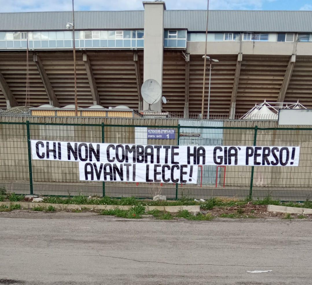 LECCE – “Chi non combatte ha già perso! Avanti Lecce”: questo  il significativo striscione dello zoccolo duro della tifoseria giallorossa esposto sui cancelli esterni del “Via del Mare” davanti alla porta numero uno. Delle parole forti ed importanti, in vista della gara d’andata delle semifinali playoff che la squadra di Eugenio Corini affronterà lunedì sera contro il Venezia al “Penzo”.