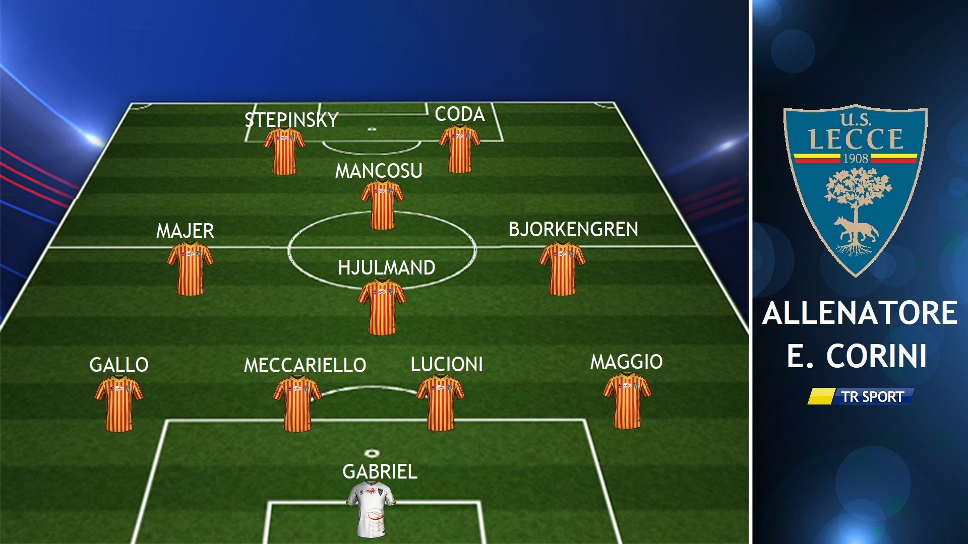 LECCE (4-3-1-2): Gabriel; Maggio, Meccariello, Lucioni, Gallo; Majer, Hjulmand, Biorkengren; Mancosu; Coda, Stepinski. Allenatore: Eugenio Corini.