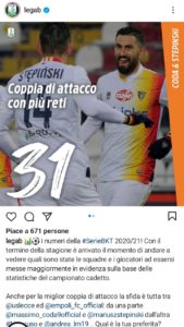 Adesso, si gode la spedizione azzurra agli ordini del c.t. Alberto Bollini e sabato mattina, l’Under 20 affronterà la Nazionale di Roberto Mancini, nel pieno della preparazione a Euro 2020. Nel frattempo, sui canali ufficiali della Lega B hanno dedicato un post ai migliori tandem d’attacco del campionato di serie B: Coda-Stepinski hanno pareggiato gli empolesi Mancuso-La Mantia, entrambi a 31 gol siglati. Il tutto in attesa della presentazione ufficiale del nuovo mister, Marco Baroni e del suo staff.