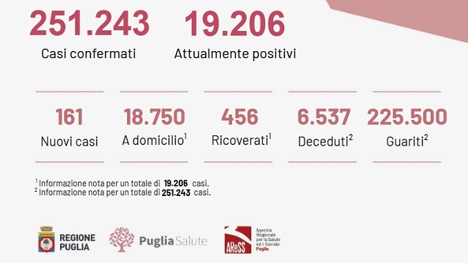 Bollettino Covid Puglia: un decesso. Su 7.220 test, 161 casi positivi