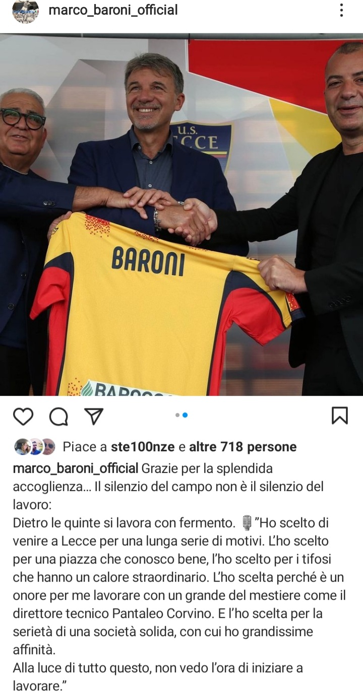 LECCE – (C. Tommasi) – “Grazie per la splendida accoglienza… Il silenzio del campo non è il silenzio del lavoro: dietro le quinte si lavora con fermento”: queste le parole arrivate dal proprio profilo Instagram, dopo qualche giorno dalla sua presentazione ufficiale, del neo allenatore del Lecce Marco Baroni. Parole calde e ricche di entusiasmo, seguite dalla citazione di quanto già dichiarato il giorno della conferenza stampa: “Ho scelto di venire a Lecce per una serie di motivi. L’ho scelto per una piazza che conosco bene, l’ho scelto per i tifosi che hanno un calore straordinario. L’ho scelta perchè è un onore per me lavorare con un grande del mestiere come il direttore tecnico Pantaleo Corvino. E l’ho scelta per la serietà di una società solida, con cui ho grandissime affinità. Alla luce di tutto questo non vedo l’ora di iniziare a lavorare”.