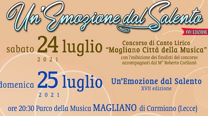 Domenica sera, invece, sarà la volta della diciassettesima edizione di “Un’emozione dal Salento”, la grande musica italiana in scena come sempre da tanti anni a questa parte in una serata di grande spettacolo, il tutto a cura dell’associazione Magliano ti amo, in collaborazione con la fondazione Cecilia Bernardini, il conservatorio Tito Schipa di Lecce e l’amministrazione comunale.