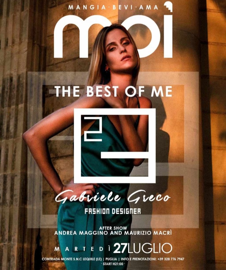 LECCE – Uno spettacolo di moda, arte, stile, tessuti, passione e amore per il proprio lavoro, quello che si sognava di fare sin da bambino: questa sera, martedì 27 luglio, grande appuntamento nella splendida location del “Moi” per lo show a tuttotondo di Gabriele Greco. L’affermato e giovante stilista salentino presenta così l’attesa e sorprendente serata: “L’inizio… l’inizio di tutto: l’amore, la passione, la seduzione, la moda, intrecci di tessuto e pietre preziose faranno da padrone per uno show spettacolare nella cornice del MOI, che racconta quello che immagino, vivo, sento, percepisco! Racconto la mia idea di arte, di bellezza e di femminilità. Tra note dal vivo , burlesque, la passione del tango, l’audacia del fuoco, il fascino dell’haute couture, ma soprattutto di follia, tutto questo per raccontando una storia, quale? La mia! The best of me”.