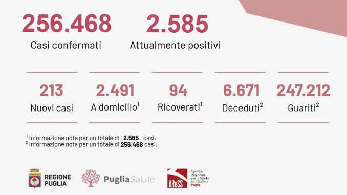 PUGLIA – Il bollettino covid della Regione Puglia delle ultime 24 ore registra 213 nuovi casi su 11.623 test. 31 contagi in provincia di Bari, 27 in provincia di Brindisi, 31 nella BAT, 25 in provincia di Foggia, 61, il dato più alto, in provincia di Lecce, 36 in provincia di Taranto, 3 casi di residenti fuori regione. 1 caso di provincia di residenza non nota è stato riclassificato e attribuito.
