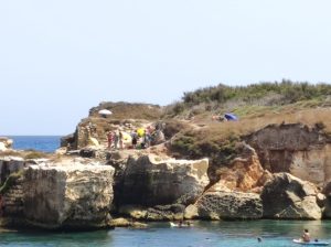 ROCA VECCHIA- I cartelloni e le staccionate dovrebbero impedire persino di percorrere a piedi il tratto che costeggia il mare lungo le antiche mura del parco archeologico di Roca Vecchia, marina di Melendugno. E invece, in barba ai divieti, un gruppo di bagnanti ha persino piantato degli ombrelloni nelle rocce della città fortificata, testimonianza della civiltà dei Messapi ma con stratificazioni di epoche diverse che risalgono alla preistoria.