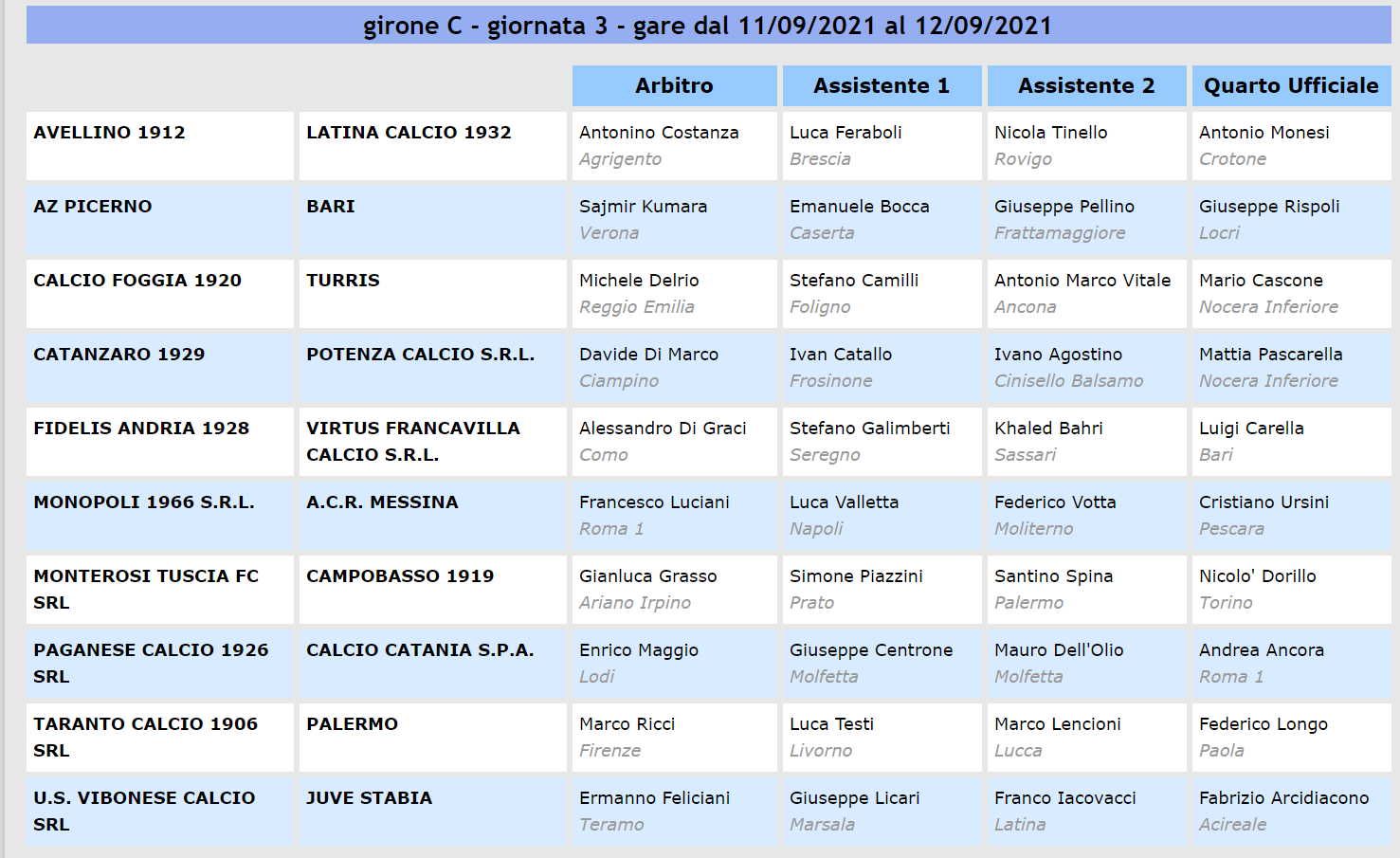 Di seguito la schermata ufficiale di tutte le designazioni del Girone C della 3^ giornata: