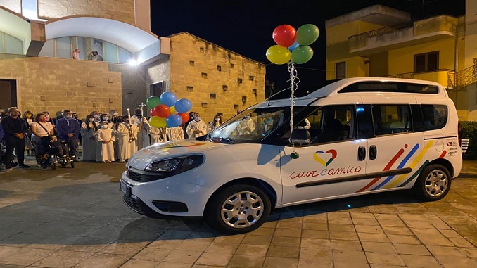 GALATONE – Il sagrato pieno di gente è esattamente il motivo per cui CuoreAmico ha deciso di effettuare la consegna delle auto speciali, frutto della raccolta fondi, di volta in volta direttamente nelle parrocchie, nei comuni dei beneficiari. Qui siamo a Galatone, Chiesa del Sacro Cuore di Gesù, con Don Francesco, e l’abbraccio di questa comunità oggi è tutto per Gioele.