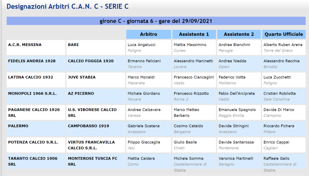 Ecco tutte le designazioni della sesta giornata del Girone C: