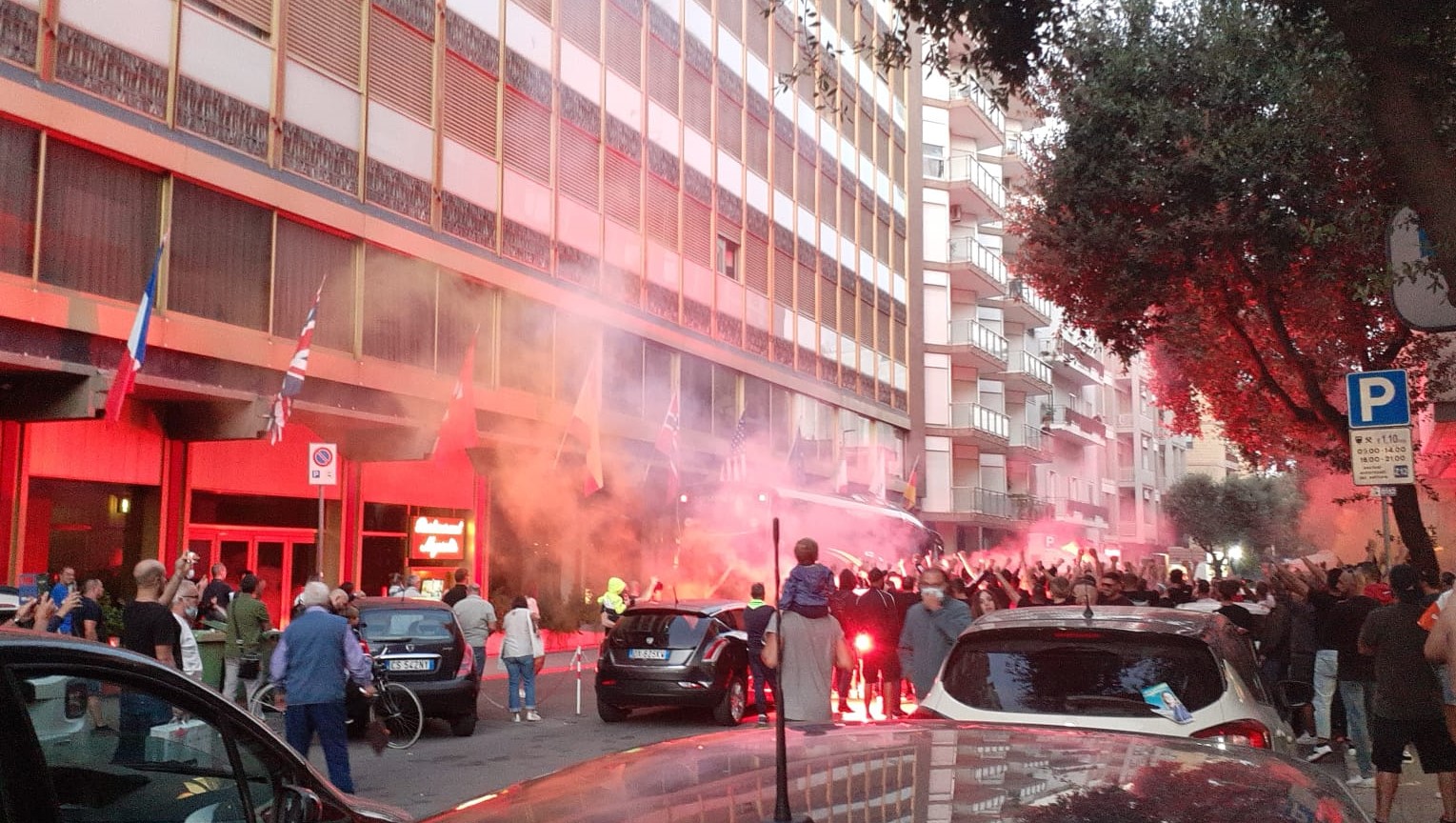 LECCE – Lo zoccolo duro dei tifosi giallorossi, gli Ultrà, che per scelta non entrano allo stadio (forse fino a quando non cadranno tutte le restrizioni), hanno raggiunto l’Hotel cittadino che ospita la squadra prima del trasferimento allo stadio e hanno incitato i calciatori con i loro cori ed hanno colorato l’aria di fumogeni giallorossi. Il grido più forte tra tutti è stato: “Noi abbiamo il Lecce nel cuore”. Loro ci sono, a modo loro, ma sono già in campo.