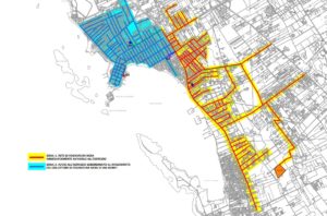 Dunque, si va avanti, nonostante tutto. E si tratta, è bene ricordarlo, di una soluzione solo transitoria, che non risolve il problema più ampio di Porto Cesareo ma che evita il passaggio nuovamente dinanzi al Ministero, dove il progetto complessivo è stato già bocciato tre volte. 480mila euro sono stati impegnati, per ora, per la trasformazione delle vecchie vasche di essiccamento in tre trincee drenanti, cioè sezioni di terreno sulle quali, dopo il trattamento, verranno scaricati fino a un massimo di 500 metri cubi al giorno di reflui, equivalenti a 3.300 abitanti. I numeri sono contenuti e c’è un motivo. La rete di fognatura nera esistente nell’abitato di Porto Cesareo è divisa in due blocchi: quello celeste, come emerge dalla cartografia a sinistra, è subordinato al completo rifacimento del collettore di via Monti, lungo più di 1 km, lavori per cui non si prevede l’ultimazione prima di 24 mesi. La parte in giallo, invece, può essere subito avviata in esercizio. Qui si prevedono un massimo di 600 utenze collettabili e, ipotizzando 4 persone per ciascuna, si giungerebbe a complessivi 2.400 abitanti, quindi al di sotto della portata delle trincee. Non si tiene conto, però, del flusso abnorme durante l’estate, quando la popolazione complessiva raggiunge i 200mila abitanti e in quella parte dell’abitato, comunque, si andrebbe oltre le cifre prospettate.