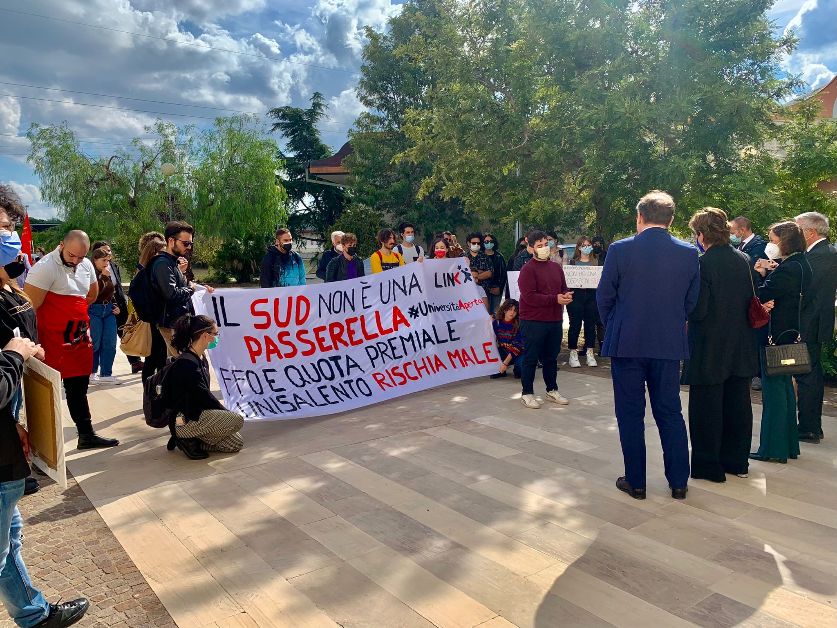 La ministra ha proseguito la visita ad Ecotekne accompagnata dal Rettore Fabio Pollice. Qui ha incontrato anche gli studenti di Link Lecce – Coordinamento Universitario che con degli striscioni hanno manifestato il dissenso nei confronti di “Un sistema che ancora una volta ci esclude e non capta le reali esigenze dell’istruzione Italiana, delegittimando di fatto ogni forma di rappresentanza studentesca. Ancora una volta- dicono- come Università del Salento veniamo penalizzati dai sistemi di ripartizione dei fondi statali, distribuzione dei quali verte ancora su dei criteri di performativitá, e che non può di certo risolvere la classificazione di Atenei di Serie A e di Serie B, incidendo ancora oggi sulla questione meridionale”.