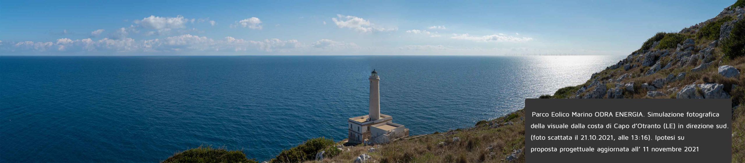 SALENTO- Intanto è stata diffusa la seconda simulazione della visuale del parco eolico marino galleggiante da parte della società Odra Energia dalla costa di Capo d’Otranto in direzione sud.