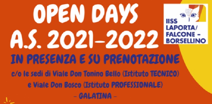 GALATINA- Al via gli Open Day presso l’Istituto Laporta-Falcone Borsellino di Galatina. Il primo è in programma oggi 18 dicembre dalle 16.00 alle 19.00. Il prossimo sarà sabato 15 gennaio   (dalle 16 alle 19) e domenica 16 gennaio (dalle 9 alle 12). Terzo e ultimo week-end di open day sabato 22 e domenica 23 gennaio.