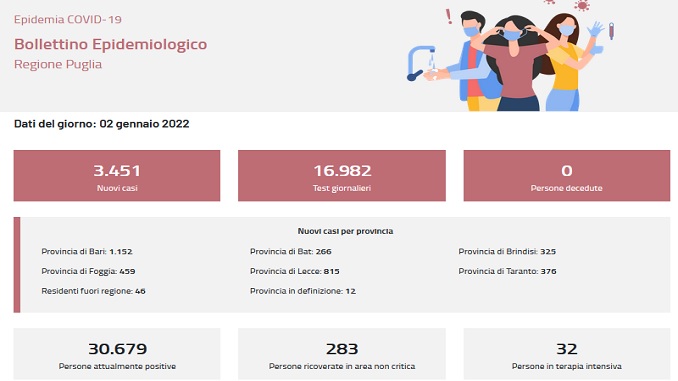 PUGLIA – Sono 3.451 i nuovi casi di contagio covid emersi in Puglia nelle ultime 24 ore, a fronte di 16.982 tamponi effettuati. Nelle stesse ore non è stato registrato alcun decesso.