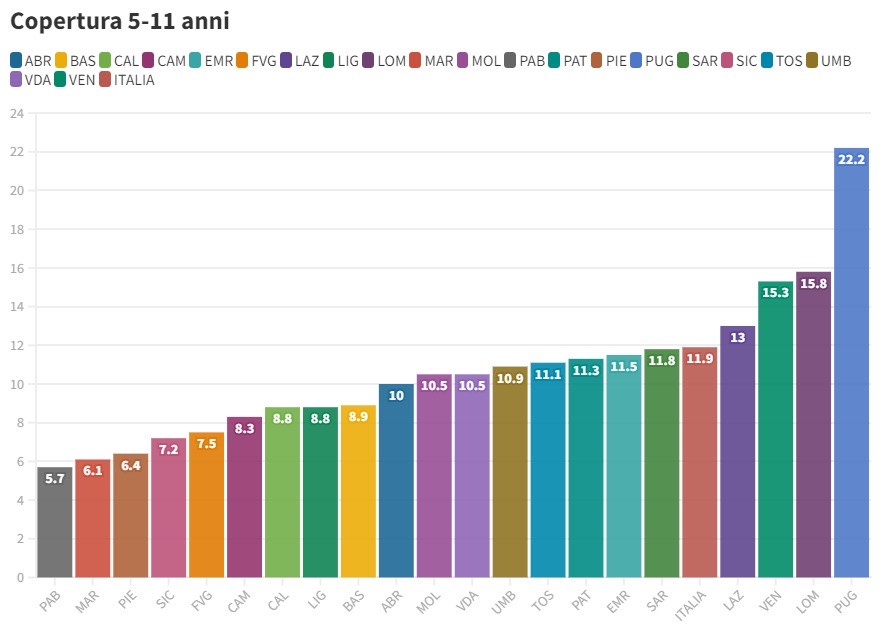 SALENTO- Come si evince da questa tabella, in Puglia, che utilizza il metodo della vaccinazione scuola per scuola, si ha la maggiore copertura d’Italia per la fascia 5-11 anni, con un dato pari al 22,2 per cento che è quasi il doppio della media nazionale.