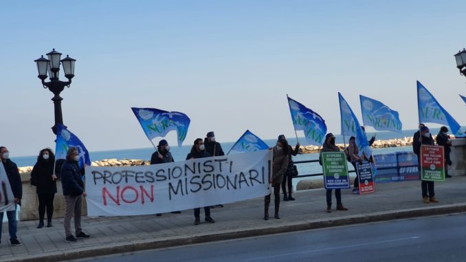 A Bari invece, il sindacato Nursind, rappresentato da Graziano Accogli, è sceso in sit-in dinanzi alla sede della regione, dove successivamente sono stati accolti da Vito Montinaro, per rivendicare i diritti degli infermieri pugliesi e salentini, affinchè ci sia il prima possibile un incremento del personale, siano dati loro degli stipendi adeguati (come a livello europeo) e che sia raggiunto un giusto rapporto tra paziente-infermiere