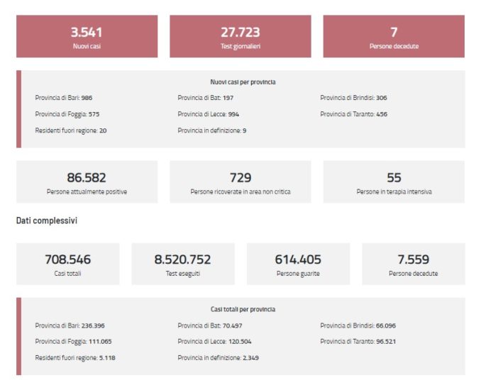LECCE – Il bollettino Covid regionale delle ultime 24 ore:  su 27.723 test effettuati, sono 3.541 i nuovi casi.