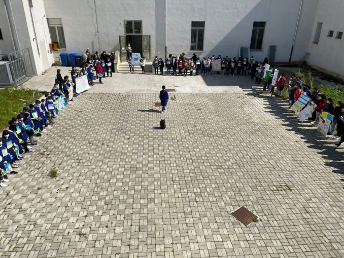 LIZZANELLO  – La scuola si mobilita , i bambini dell’Istituto Comprensivo di Lizzanello e Merine, colorano la giornata e con un flash mob chiedono la pace.