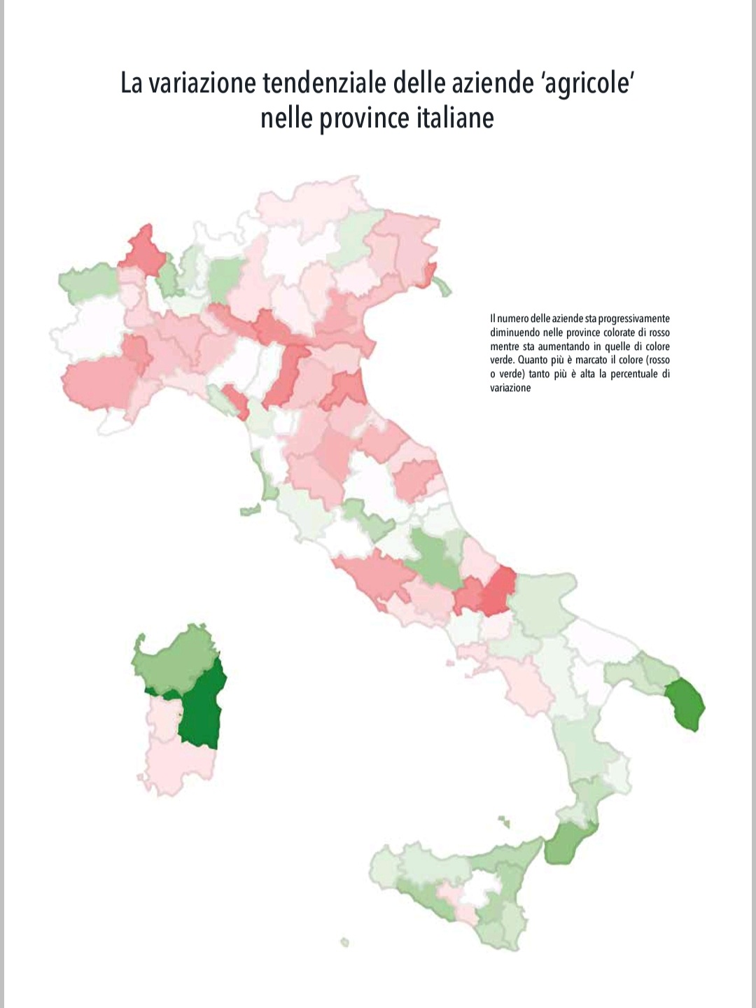 LECCE – Questa cartina, che vede la provincia di Lecce colorata di verde scuro, contiene una buona notizia: il numero delle aziende agricole è progressivamente cresciuto, con la percentuale più alta d’Italia, dopo la provincia di Nuoro, in Sardegna.