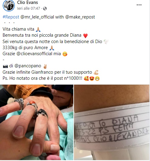 La piccola   è la secondogenita in casa Spedicato. Ricordiamo che a fare da fratello maggiore c’è Ianko di 4 anni, venuto alla luce dopo un periodo buio per la coppia, causato dal malore che aveva colpito proprio Lele. Ma l’amore della sua famiglia ha avuto la meglio e oggi è solo un brutto ricordo. Adesso Lele, Clio, Ianko e Diana sono più forti che mai. Tanti auguri!