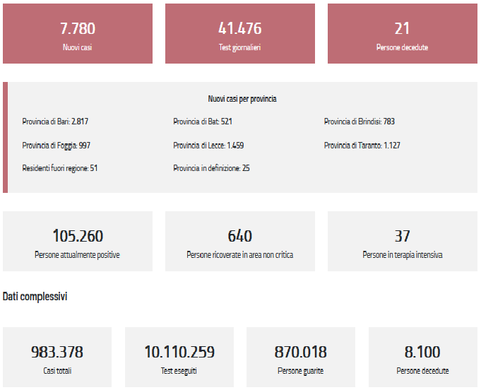 PUGLIA – Sono 7.780 i nuovi casi di contagi da coronavirus in Puglia su 41.476 test giornalieri registrati.