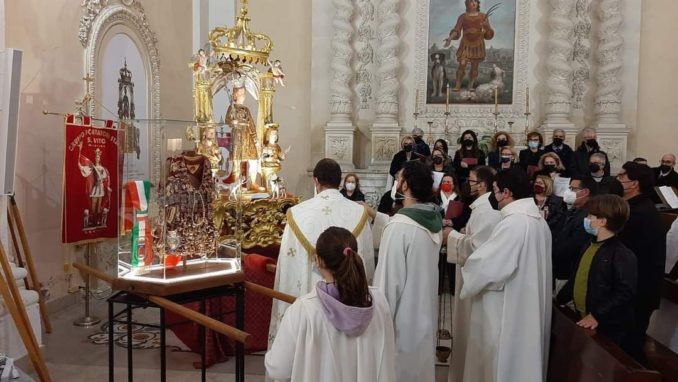 Dopo il consolidamento statico dell’apparato scultoreo e il restauro fedele all’originale, il simulacro del santo ausiliatore è tornato a rifulgere come il sole con le sue guance rosse. Così i devoti lo contemplavano tra la luce fioca delle candele a cavallo tra il 1600 e il 1700. Sull’abito intarsiato è ricomparsa l’epigrafe in latino dimenticata: al solo dio onore e gloria che indica la via da seguire testimoniata anche dai santi Modesto e Crescenzia e dagli angeli che cingono la corona. Martedì di Pasquetta a Lequile si commemorano i 300 anni dell’arrivo delle reliquie di San Vito martire, il santo taumaturgo che protegge da tutti i mali.