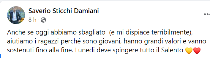 “Anche se oggi abbiamo sbagliato (e mi dispiace terribilmente), aiutiamo i ragazzi perché sono giovani, hanno grandi valori e vanno sostenuti fino alla fine. Lunedì deve spingere tutto il Salento”. Questo il messaggio del presidente Saverio Sticchi Damiani.