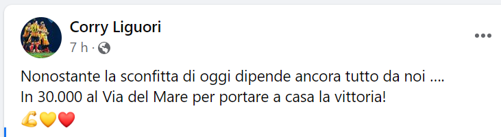 A fare da eco il vicepresidente Corrado Liguori: “Nonostante la sconfitta di oggi dipende ancora tutto da noi… In 30.000 al Via del Mare per portare a casa la vittoria”.