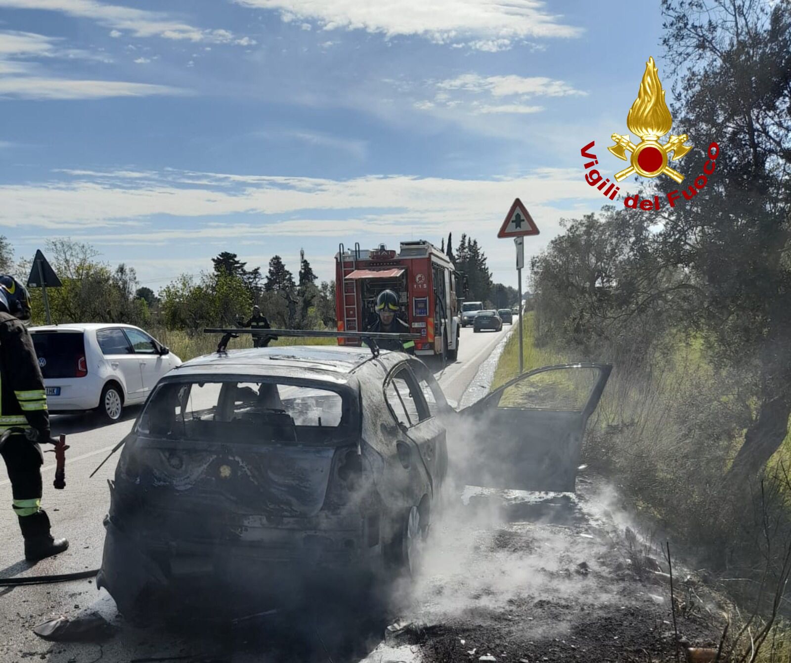Paura sulla Galatone-Nardò, auto in fiamme sulla carreggiata. Il conducente riesce a salvarsi