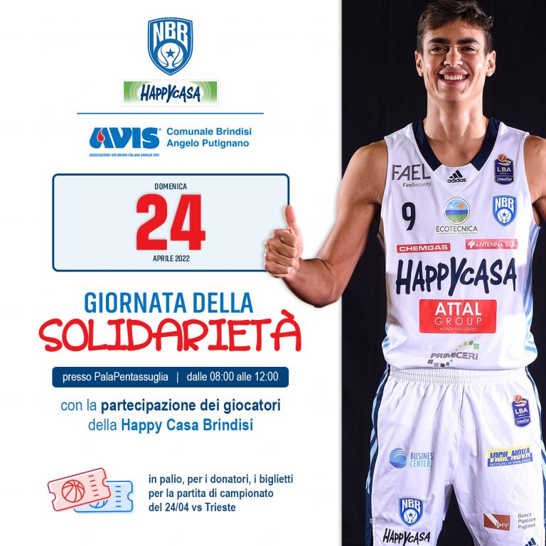 BRINDISI – Il 24 aprile 2022 sarà una domenica veramente particolare per Brindisi che aprirà le porte del PalaPentassuglia mattina e pomeriggio; dalle ore 08:00 alle ore 12:00 largo alla Giornata della Solidarietà e dalle 18:30 palla a due della sfida con Trieste che può valere una stagione.