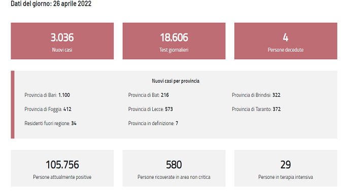 PUGLIA – Sono 3.036 i contagi da coronavirus in Puglia oggi, 26 aprile 2022, secondo numeri e dati covid del bollettino della regione. Registrati altri 4 morti. I nuovi casi sono stati individuati su 18.606 tamponi. Le persone attualmente positive in Puglia sono 105.756. I pazienti covid ricoverati in ospedale in area non critica sono 580. In terapia intensiva, invece, 29 malati.